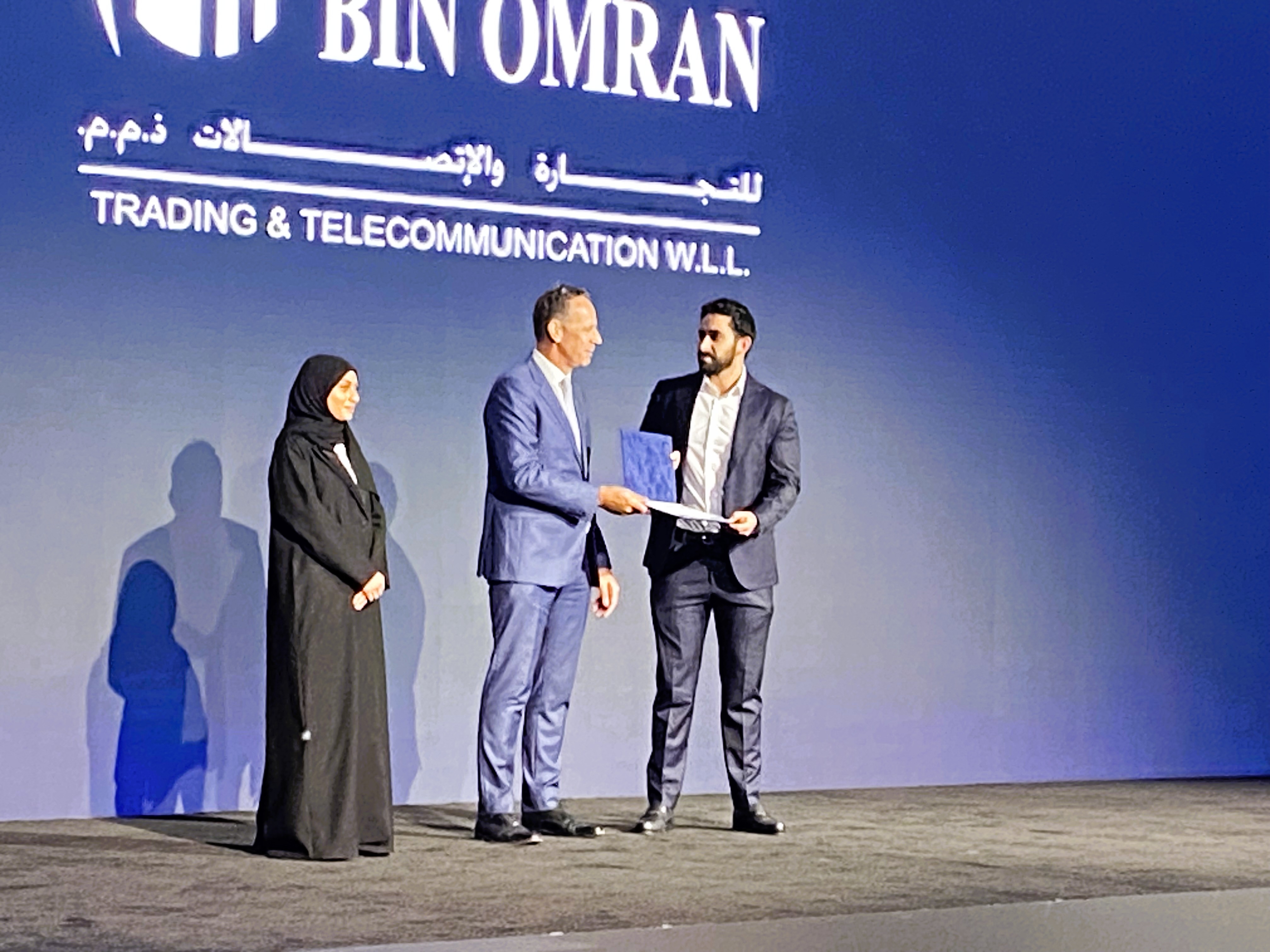 A proud moment captured during a recognition ceremony at Bin Omran Trading & Telecommunication W.L.L., celebrating excellence and achievement in the industry, honoring dedication and innovation contributions.